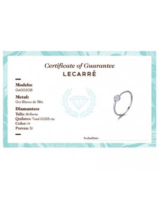 Carro Lista de deseos Anillo en Oro 18Kt. y... Precio 335,00 € Anillo de Oro blanco de primera ley (750/1000) con 1 diamante de peso total 0,05 qt. (Color: Top Wesselton (G) Pureza: SI).