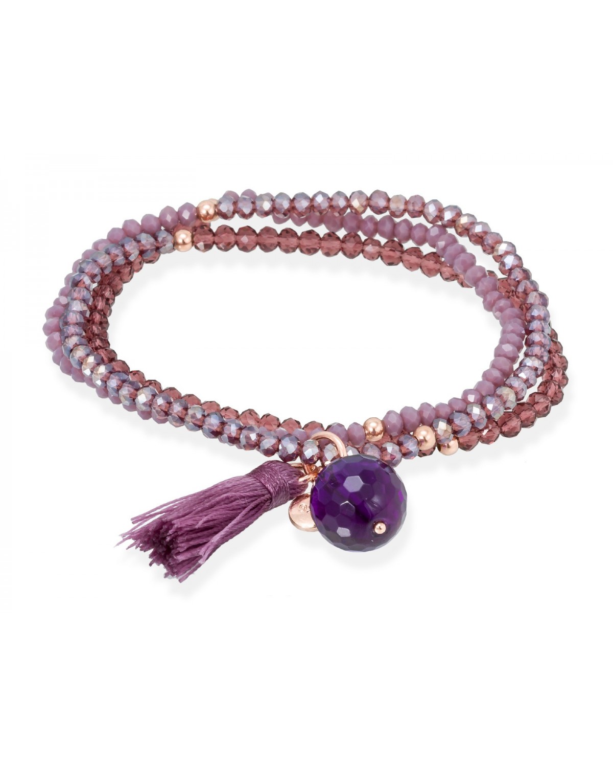 Pulsera de plata de primera ley (925) chapada en oro rosa de 18kt con cristal de Strass facetado color triple burdeos y amatista. (largo: 51 cm.)
